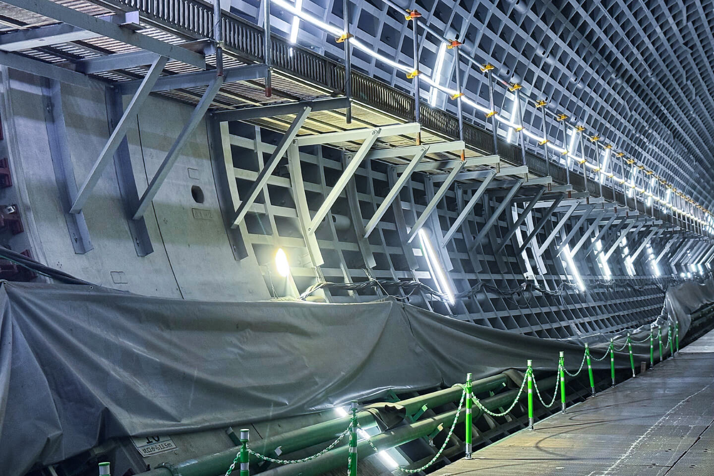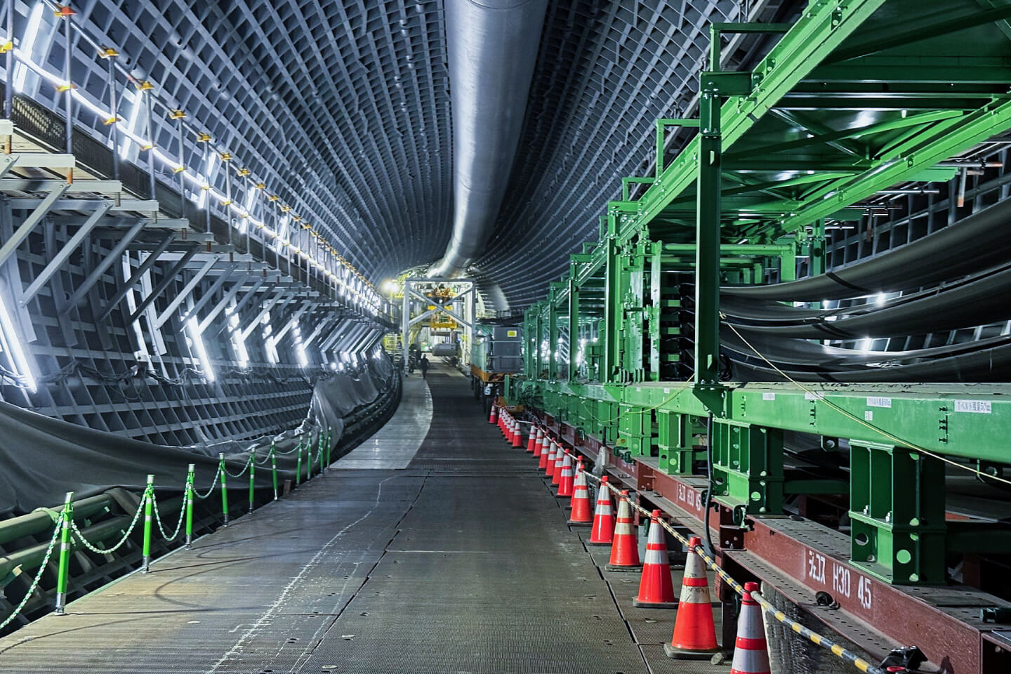 (進行方向左側に安全通路、進行方向右側に風管)切羽側